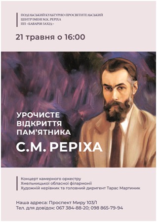 Урочисте відкриття пам’ятника С. М. Реріху відбудеться 21 травня 2021 року на території «Мистецького простору» Подільського культурно-просвітительського Центру ім. М. К. Реріха. Початок о 16:00 за адресою: м. Хмельницький, проспект Миру, 103/1.