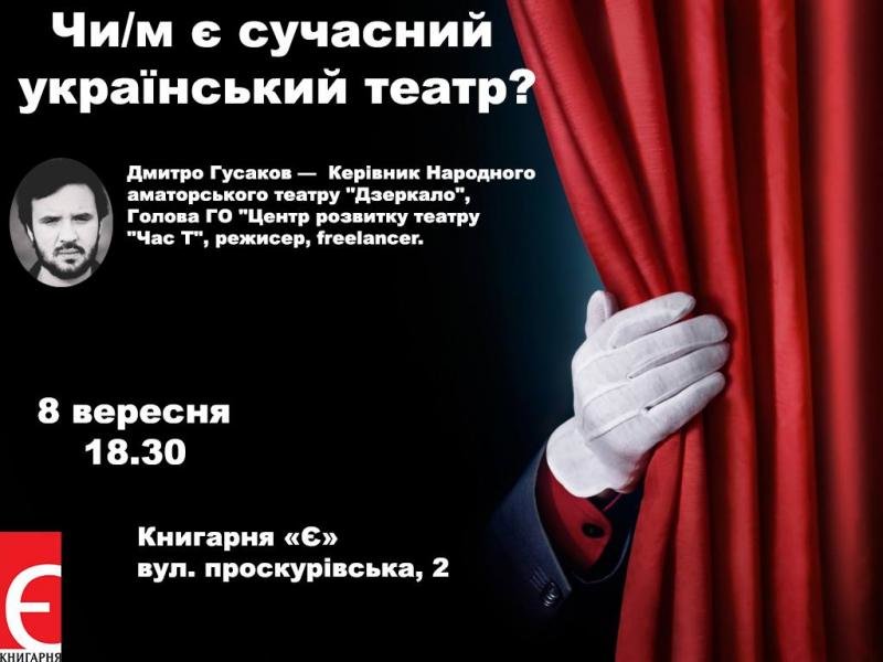 Книгарня «Є» запрошує на лекцію керівника Народного аматорського театру "Дзеркало", голови ГО "Центр розвитку театру "Час Т" Дмитра Гусакова «Чи/м є сучасний український театр?». Захід відбудеться 8 вересня.