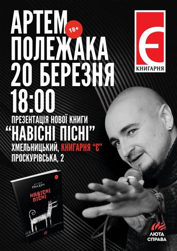 Книгарня «Є» і видавництво «Люта Справа» запрошують на презентацію збірки Артема Полежаки «Навісні пісні», яка відбудеться 20 березня за участю автора. Початок – о 18.00.