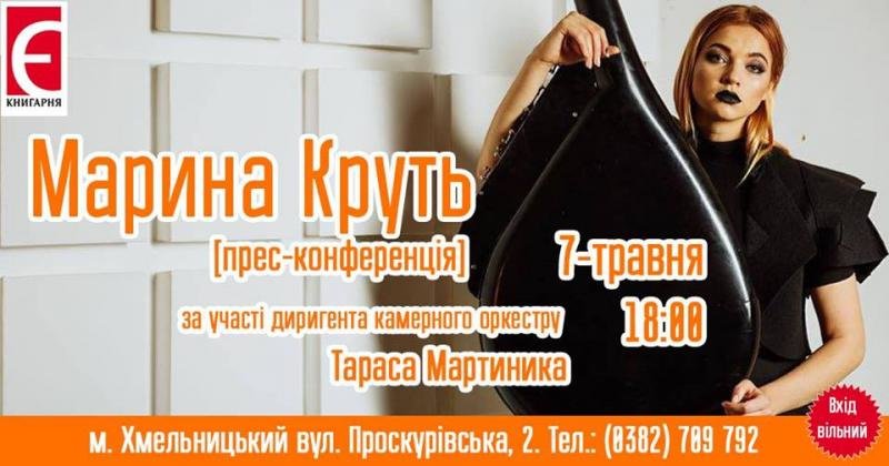 Книгарня «Є» запрошує відвідати прес-конференцію та автограф-сесію із солісткою гурту KRUT Мариною Крут та диригентом камерного оркестру Тарасом Мартиником. Захід відбудеться 7 травня. Початок – о 18.00.