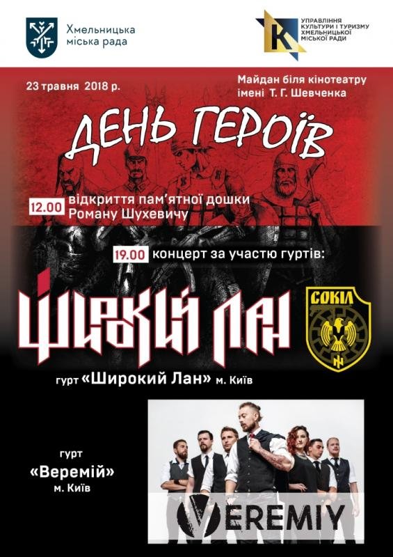 З нагоди Дня Героїв 23 травня о 19:00 на майдані біля кінотеатру ім. Т. Шевченка відбудеться концерт за участю гуртів "Широкий Лан" (м. Київ), "Веремій" (м. Київ).