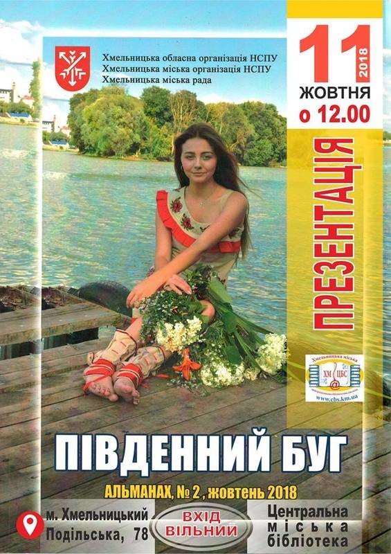 11 жовтня 2018 р. о 12.00 у Хмельницькій центральній бібліотеці (вул. Подільська, 78) відбудеться презентація другого випуску літературно-публіцистичного альманаху «Південний Буг» Хмельницької обласної організації Національної спілки письменників України (НСПУ)