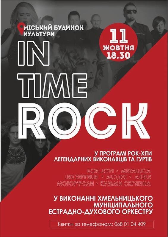11 жовтня у міському будинку культури (вул. Проскурівська, 43) відбудеться концерт "ROCK IN TIME" Хмельницького муніципального естрадно-духового оркестру. У програмі: рок-хіти легендарних виконавців та гуртів.