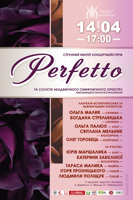 Струнний квінтет "Perfetto" створено за ініціативою концертмейстерів струнної групи Академічного симфонічного оркестру. У його складі було 5 яскравих музикантів - Ольги Малик, Ольги Левченко, Ольги Палюх, Світлани Мельник та Олега Горобця, які у 2014 році об’єдналися як квінтет у прагненні відродити на хмельницькій сцені традиційні камерні форми музикування. Відтоді їх творча активність реалізувалася у ряді ідей та мистецьких проектів, зокрема участі в концертах щорічного Міжнародного фестивалю камерно музики «Хмельницький камер фест», а також яскрава сторінка їх творчої біографії - сольна програма 03 жовтня 2018 року, що була створена у співпраці з солістами філармонії Максимом Заводним (гітара), Ігорем Прохніцьким (гобой), Тарасом Маликом (флейта) та Романом Ульяновим (ударні). У програмі прозвучали твори О. Респігі, Й.С. Баха, А. Шнітке, А. Фута, Л. Боккеріні.