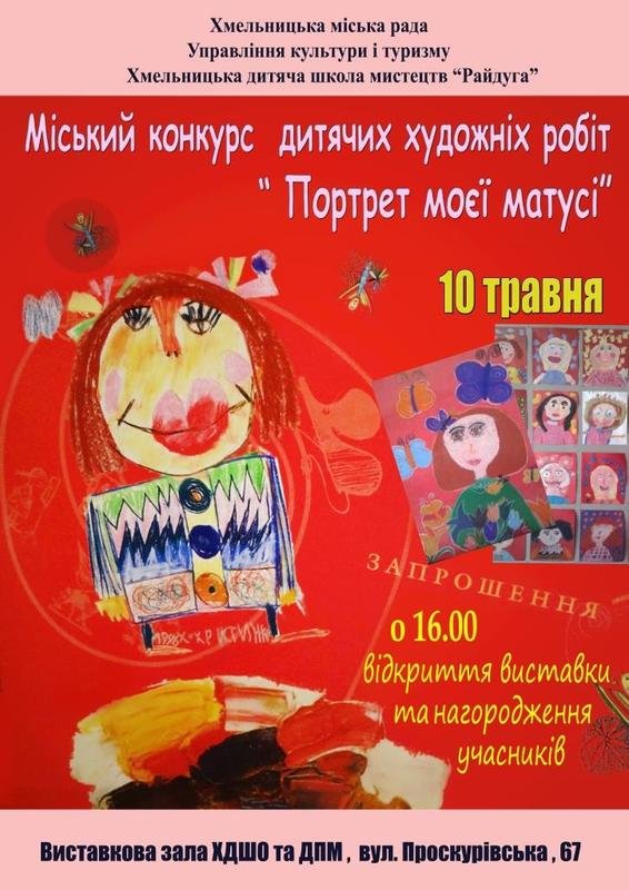 Відкриття виставки та нагородження переможців ІІ міського конкурсу дитячих художніх робіт «Портрет моєї матусі» з нагоди відзначення Міжнародного Дня матері відбудеться 10 травня 2019 року о 16:00 у виставковій залі Хмельницької дитячої школи образотворчого та декоративно прикладного мистецтва (вул. Проскурівська, 67).