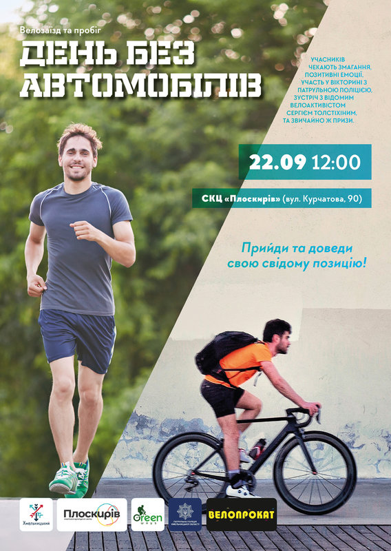 До Дня без автомобілів для всіх бажаючих Спортивно-культурний центр «Плоскирів», спільно с Управлінням патрульної поліції в Хмельницькій області влаштовує на стадіоні велозаїзд та забіг, метою яких є популяризація еко-безпечного транспорту та здорового способу життя.
