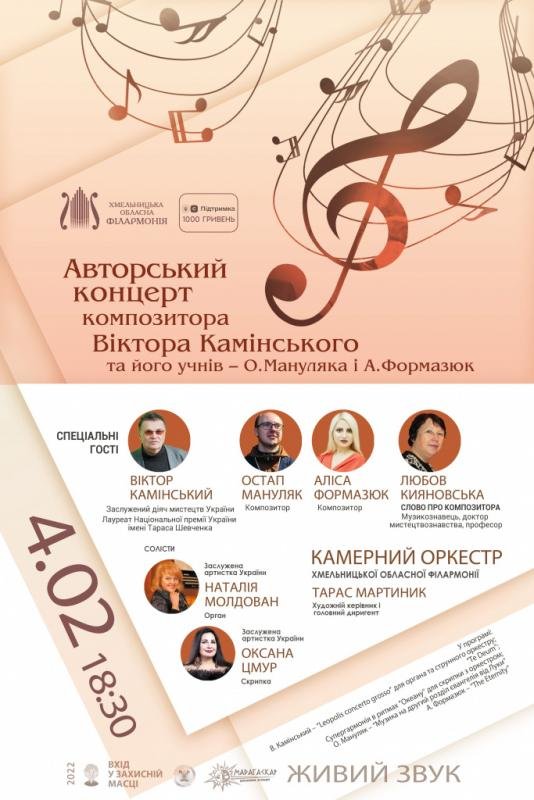 4 лютого о 18.30 Хмельницька обласна філармонія запрошує на авторський концерт композитора, лауреата національної премії імені Т. Шевченка Віктора Камінського та його учнів О. Мануляка і А.Формазюк!