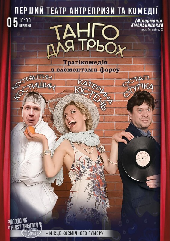 “Танго для трьох” - це унікальна своєрідна трагікомедія, яка більше ніж на 2 години занурить вас у вічну тему - стосунків чоловіка та жінки.