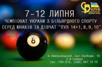 З метою розвитку більярдного спорту в Україні, виявлення найсильніших команд та спортсменів, підготовки для участі в офіційних міжнародних змаганнях з 7 по 12 липня у Хмельницькому відбудеться Чемпіонат України з більярдного спорту серед юнаків та дівчат «Пул 14+1, 8, 9, 10».
