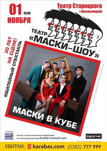«Главная идея постановки в том, что мы все стремимся получить свободу, - говорит режиссер театра Георгий Делиев, но очень часто становимся рабами своих же стереотипов. «Маски в кубе» рушит все границы восприятия, каждый может увидеть здесь что-то свое и о себе, наша задача создавать такое, что в принципе невозможно объяснить словами». Спектакль "Маски в кубе" основан на новых номерах и режиссерских идеях, начиная от комедийных трюков и заканчивая декорациями на сцене. Однако, в шоу войдут и полюбившиеся зрителю пантомимы «Масок», такие как культовый "Вокальный дуэт Мана-мана-тынч-тынч-тытырым", который впервые появился на телевидении в 1985 году, "Танец умирающего лебедя" и "Танец самовара и чашек" из "Маски в опере". В спектакле принимают участие: Народный артист Украины Георгий Делиев, Народный артист Украины Борис Барский, Заслуженная артистка Украины Наталья Бузько, Александр Постоленко, Игорь Малахов, Михаил Волошин и др.
