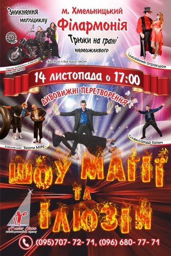 Київська артистична агенція «Майстер Шоу» запрошує усіх бажаючих відпочити та зробити захоплюючу подорож у невідомий та чарівний світ магії та ілюзій. Видовище у 2х відділеннях , у якому фокусник - ілюзіоніст Олександр Гапич продемонструє трюки всесвітньо відомих ілюзіоністів світу таких як Гаррі Гудіні та Девід Коперфільд, а саме