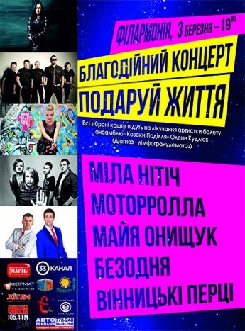 Зібрані кошти будуть спрямовані на лікування раку лімфи в артистки балету Академічного козацького державного ансамблю пісні та танцю "Козаки Поділля" Альони Кудлюк. Участь беруть: