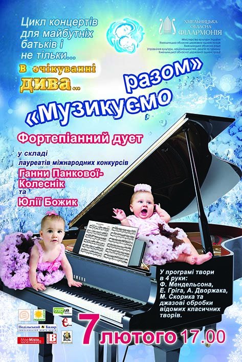 твори в 4 руки: Ф. Мендельсона, Е. Гріга, А. Дворжака, М. Скорика та джазові обробки відомих класичних творів.