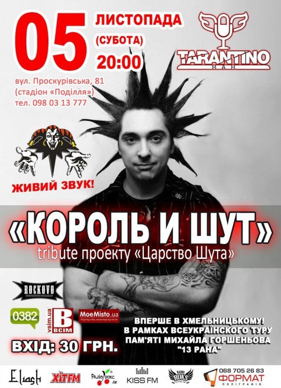 Триб'ют-гурт "Царство Шута" (м. Полтава) виступить з великою 2-х годинною програмою в рамках всеукраїнского туру пам'яті Михайла Горшеньова "13 РАНА". Пропонуємо Вам разом з нами згадати воїстину ВЕЛИКОГО музиканта і зануритись в страшну та водночас веселу казку під назвою "Король і Шут"