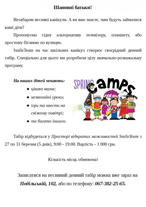 За тиждень весняні канікули. Ми продовжуємо набір дітей у денний табір. Для школярів у нас розроблена цікава і насичена програма.