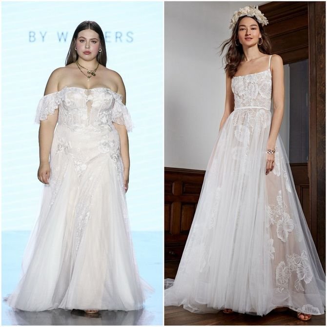 У першому випадку використанням одного відтінку створюється цілісний образ. Колір весільного плаття підбирається так, щоб найкращим чином підкреслити красу і чарівність нареченої.