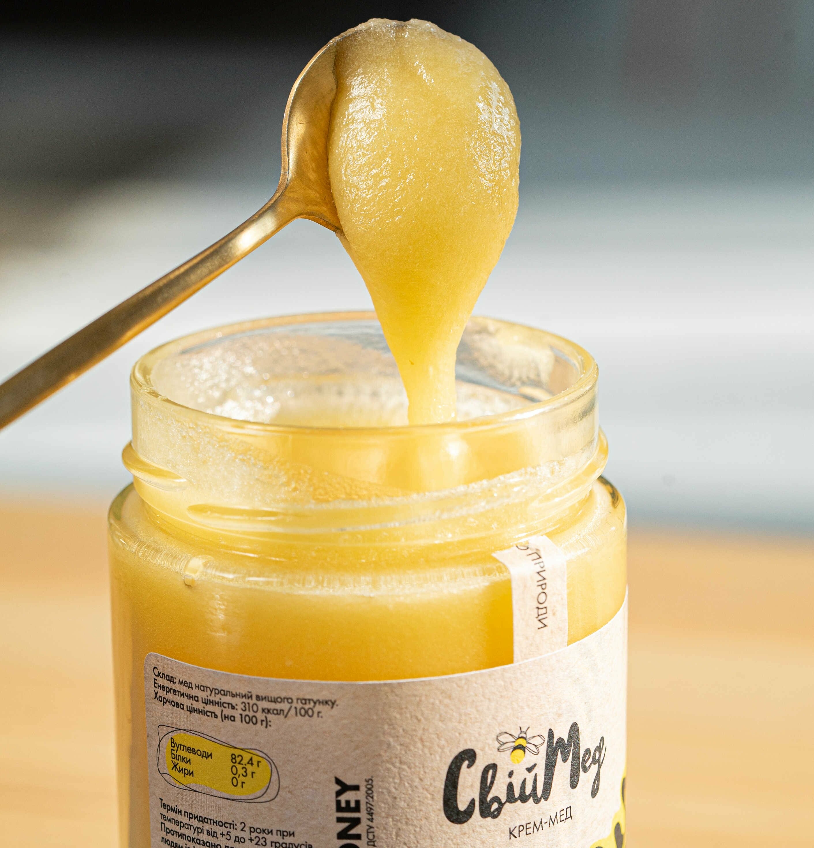 Крем-мед — це той самий натуральний мед, але збитий до ніжної, пастоподібної консистенції. Він не розтікається, легко намазується та довго зберігає стабільну структуру. Найчастіше основою для крем-меду обирають саме соняшниковий мед, адже після збивання він стає м’яким, повітряним і зручним для дітей та дорослих.