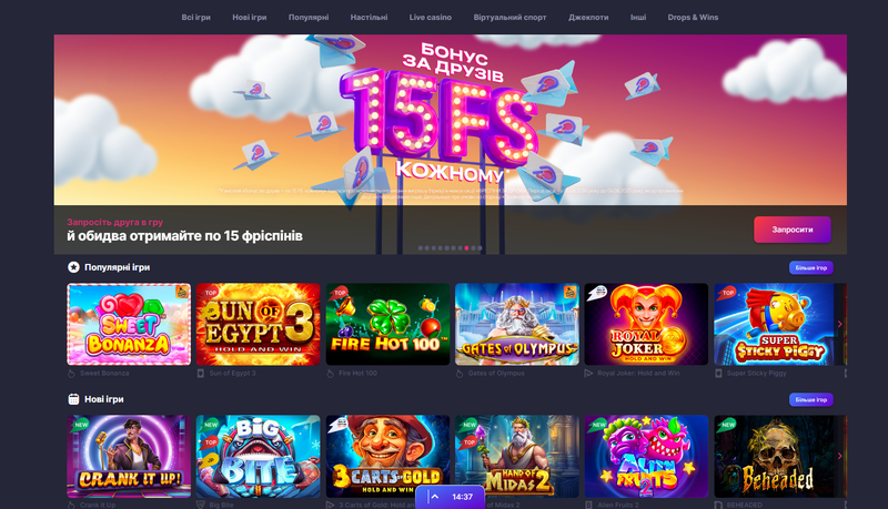 Ця платформа є сучасним віртуальним ресурсом, де до розгляду користувачів зібрано велику кількість азартних розваг у зрозумілому та доступному форматі. Інтерфейс цієї платформи створений таким чином, щоб кожен із геймерів зміг швидко переходити між розділами, а також знаходити потрібні розваги, переглядати актуальні пропозиції і навіть дізнаватися інформацію про якісь нові чи уже наявні бонуси.